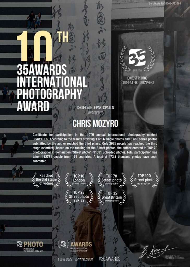 The results of the 10th 35AWARDS 2024 have been announced, with 112,700 photographers from 174 countries submitting over 473,000 images. I’m proud that my work ranked among the Top 10 London photographers, Top 35 in Great Britain, Top 70 Street Photos, and Top 35 Street Photo Series. Grateful to be recognised on such an international stage.